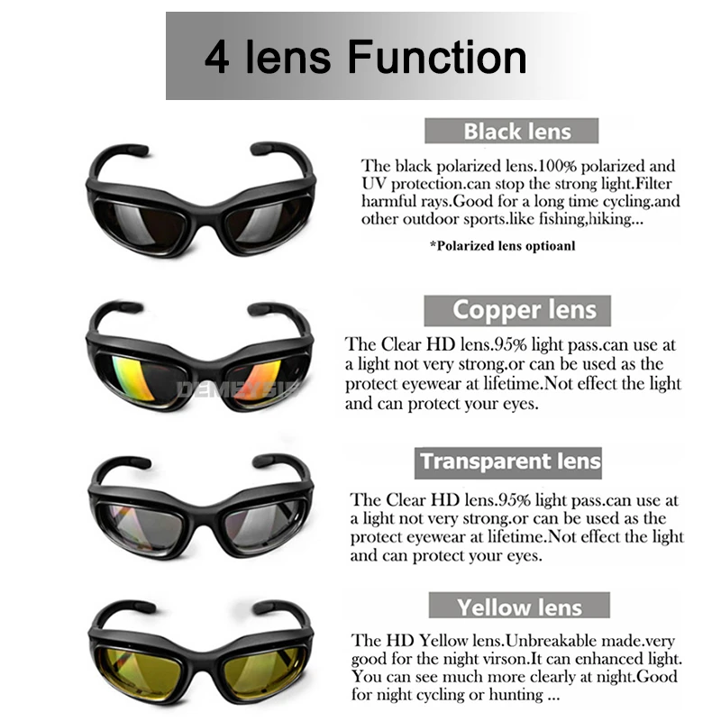 ?4 lentes intercambiáveis-1 lente polarizadaOu não polarizada; 3* Lente não polarizada: Lente transparente, Lente amarela, Lente de cobre.